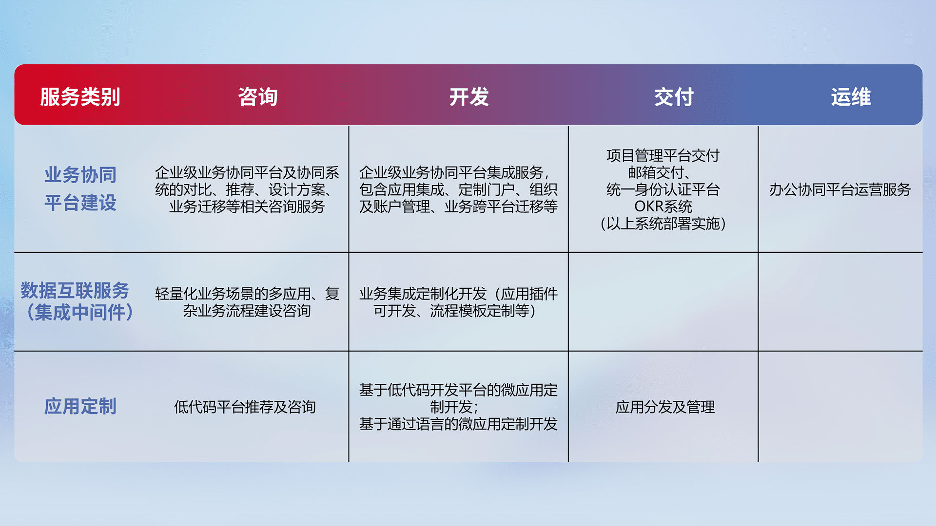 针对钉钉、、、、企微、、、IDaas等平台级产品提供产品的规划、、、方案、、、、交付、、定制化开发等服务,,,,实现如统一协同办公、、、智能客户服务、、、、混合会议管理、、智能数据查询、、等业务场景,,实现数字化转型。。。。